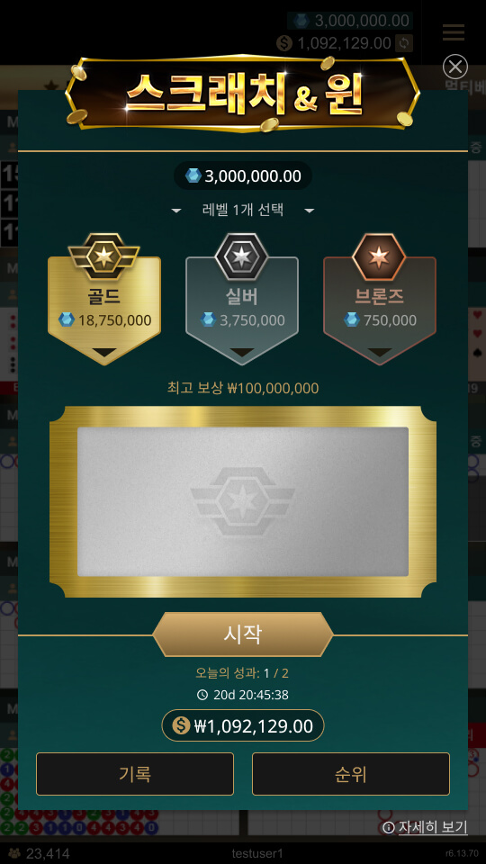 이벤트 기간 동안 당첨기록("기록" 버튼을 통해)과 상위 플레이어의 누적 당첨금 순위표("랭킹" 버튼을 통해)를 확인할 수도 있습니다.